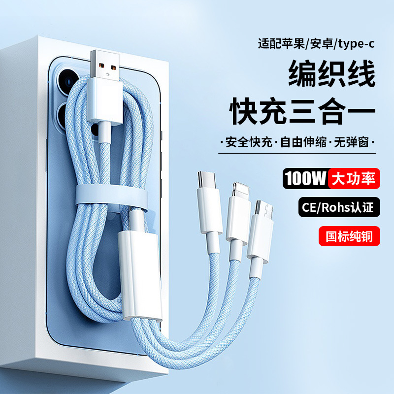 适用苹果一拖三编织快充数据线车载三合一type-c华为安卓 充电线
